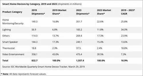 由于消費者在家中采用越來越多的設備,以及全球產品和服務的可用性在增加,預計2019 -2023年全球智能家居市場的復合年增長率(CAGR)將達16.9%,且預計到2023年將全球智能家居設備出貨量將達16億臺。