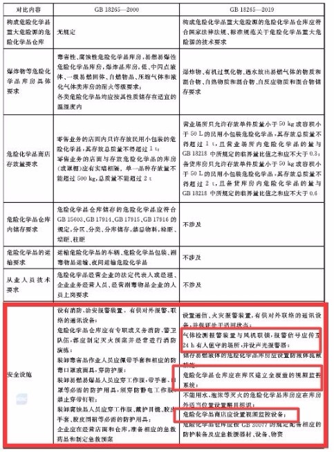 相較于上一版標準,2019新版《危險化學品經營企業安全技術基本要求》標準明確表示危險化學品倉庫應在庫區建立全覆蓋的視頻監控系統,危險化學品商店應設置視頻監控設備,另外還需要設置相應的聲光報警器。