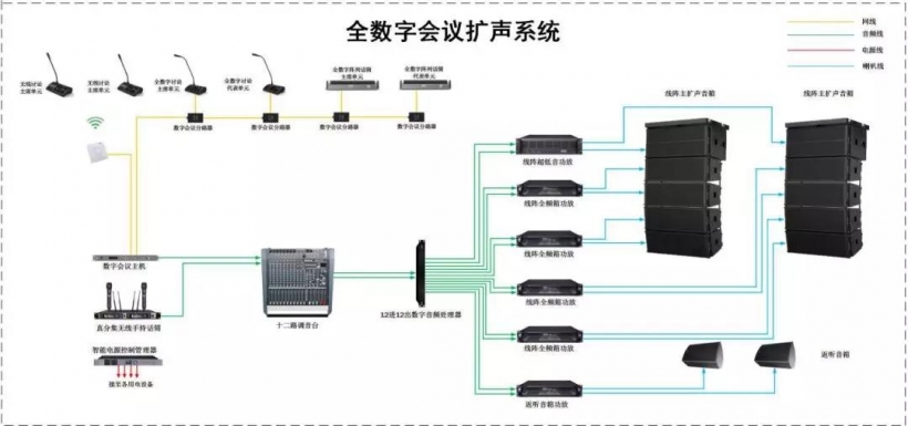 全數字會議擴聲系統利用計算機、數字及網絡技術進行各系統組網,線路上傳輸的均為數字化信號,不僅大大改善了音質,提高了系統可靠性,而且從根本上消除了一般會議系統存在的干擾、失真、串音及系統不穩定等缺陷。使每一位與會代表均能收聽到穩定、純正的聲音。