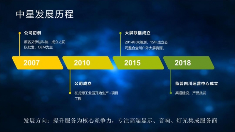 四川中星視顯科技有限公司成立于2010年4月30日,注冊資本5080萬元人民幣,是一家LED高清節能全彩顯示屏、液晶拼接屏、會議系統安裝、銷售、維護于一體的高科技企業。各市縣擁有多家優秀經銷商,營銷網絡和經典案例遍布全國。我公司行業內領先,專業從事LED銷售及服務,致力于為國內的專業渠道客戶和終端客戶提供高質量、高性能的LED應用產品及解決方案。