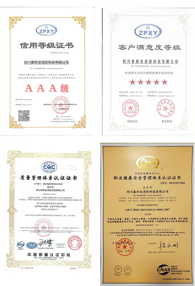 公司自成立來取得大小證書共 30余 件,主要生產七氟丙烷滅火設備、自動跟蹤定位射流滅火系統、超細干粉滅火裝置、感溫自啟動滅火裝置、城市消防遠程監控系統,產品一經推出深受市場高度認可。