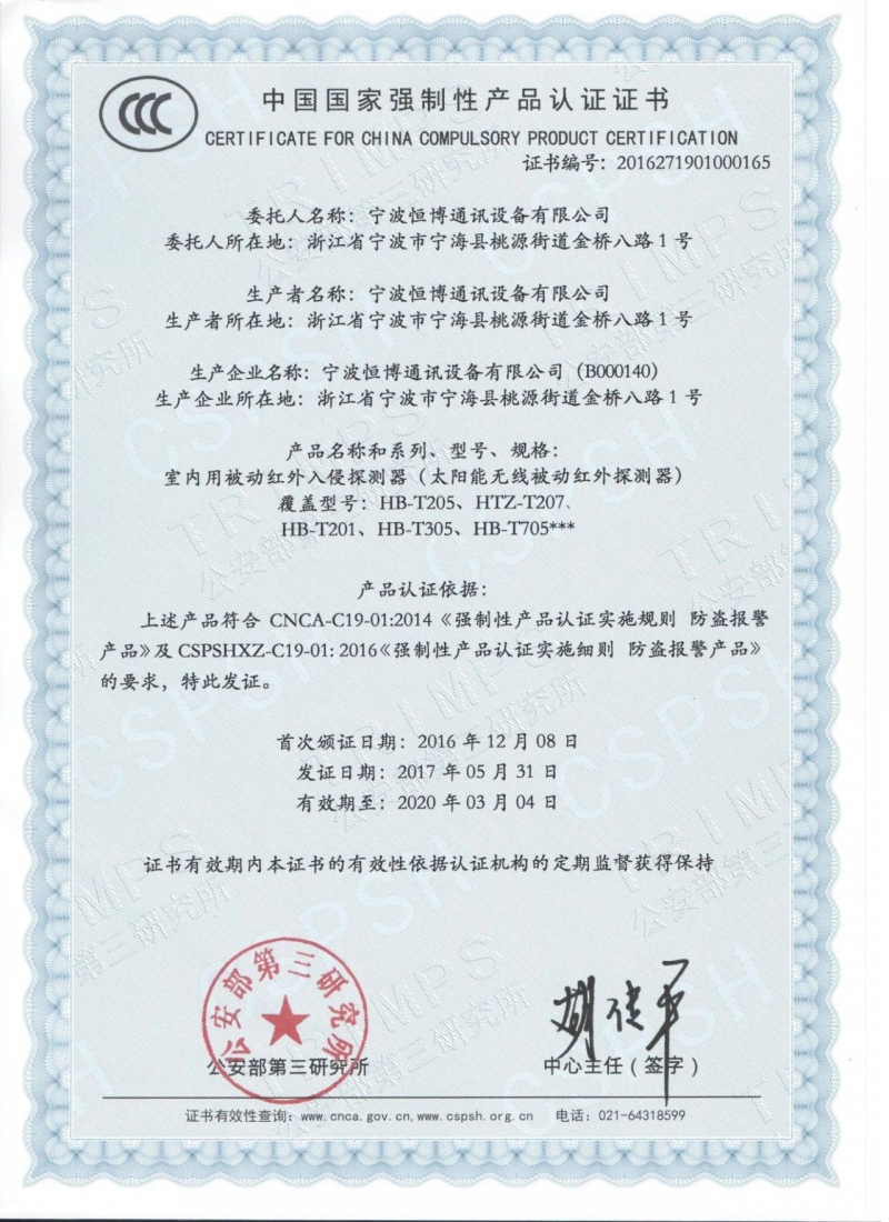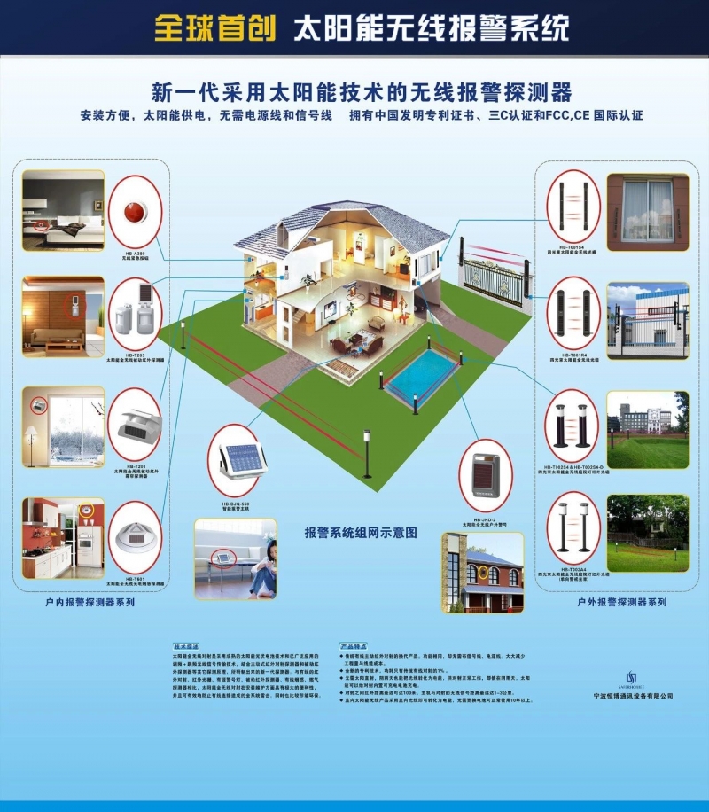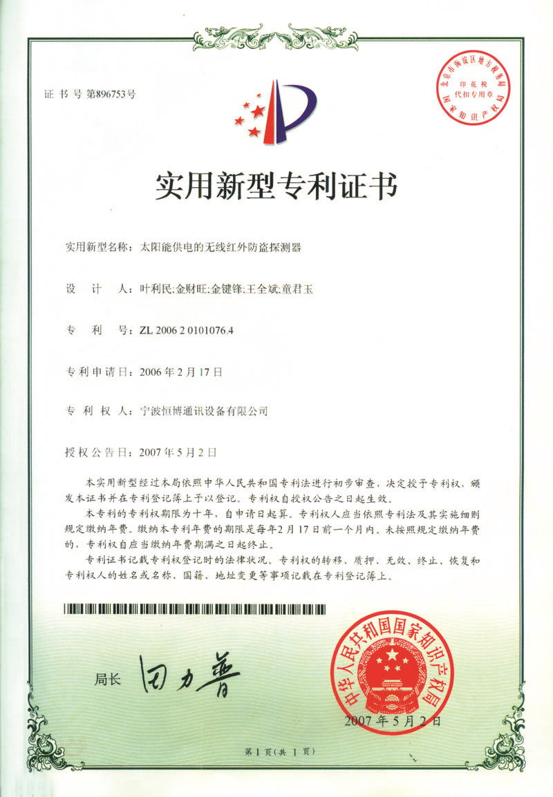 多年來公司致力于發展家居安防的智能化建設。于2007年就已獲得“太陽能供電的無線紅外對射”國家實用新型專利證書,2011年又獲得 “一種紅外對射裝置發送端的紅外信號產生方法”國家發明專利。我公司在不斷的發展過程中,得到了寧波、寧海等地方政府相關部門以及西安高新區有關部門的大力支持和幫助,取得了眾多的贊揚和榮譽,多年來相繼被寧波市科委譽為寧波市高科技創新企業、可連續投資企業、高科技苗子型企業、市雙軟企業等。所研發的產品通過多年的應用和不斷改進,安全穩定性得到了廣大用戶的認可和好評。2010年取得了自營出口權,產品目前已出口到歐美等三十幾個國家。
