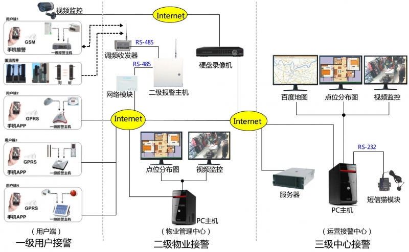 2015年又推出了以互聯網接入為主的接警平臺,兼容GPRS接入、GSM短信接入、大功率射頻無線接入等多種方式,實現報警后及時聯動顯示點位分布圖、百度地圖、視頻監控畫面,可滿足用戶手機APP,微信布撤防,能兼容遵循國際標準協議設計的各廠商報警設備。實現小區物業和接警中心三級同步接警處警,并具有視頻錄像存儲,定時自動巡檢,服務到期提醒,實時數據備份和恢復等多種功能的綜合性接警服務平臺;在系統安全性、靈活性及綜合運行成本等方面都遙遙領先于傳統平臺。