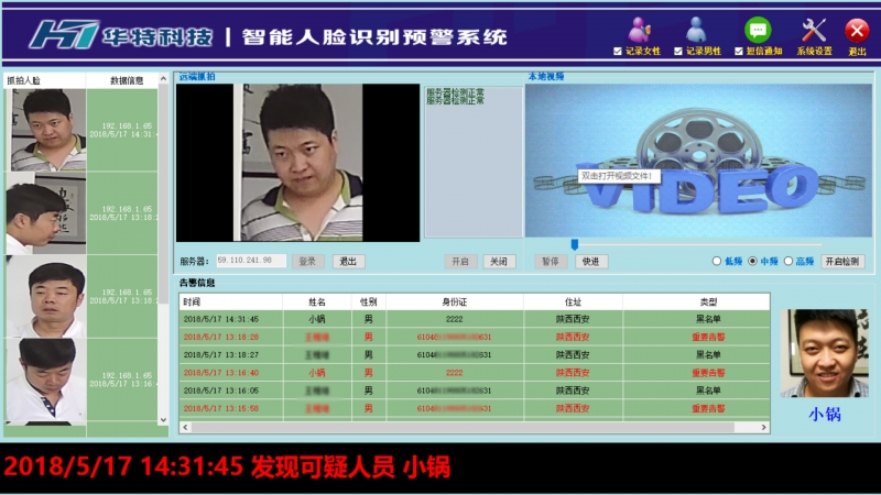 可疑人員預警系統通過人臉識別技術,根據人的面部信息來進行身份識別,預警攝像機360度全方位進行自動采集、云端比對識別,一旦發現可疑人員將對其進行抓拍并上傳至云端存儲,同時遠程輸出語音報警。并將可疑人員信息包括人臉圖片以短信方式發送至預先設定的手機上,有效的解決了傳統視頻監控系統耗費大量人力和時間資源問題,為安防系統事前預警、事后調查分析提供了有效的手段,特別適用于邊防警戒區域、無人值守電站、機場周界、石油管道、工礦企業、小區、校園、農業防盜、果園、政府場所、油庫、地鐵、鐵路、隧道、景區、汽車站、火車站、高鐵站等。