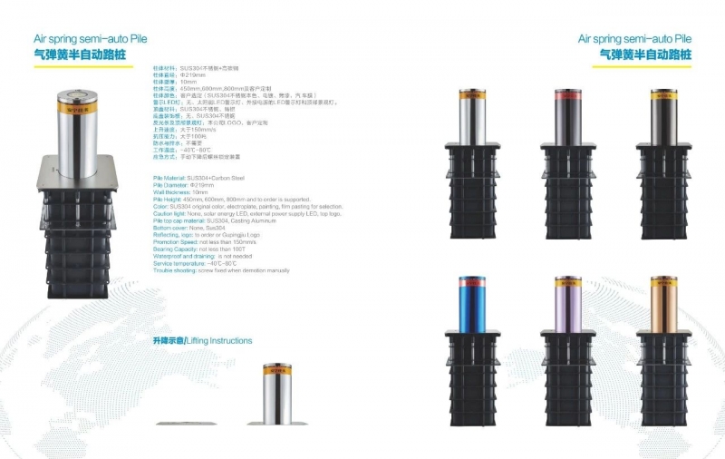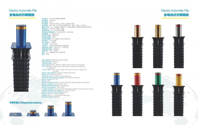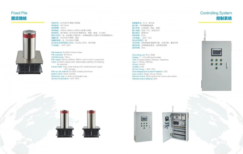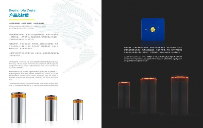 固定式路樁、氣彈簧半自動升降路樁、全電動式自動升降路樁,柱體均采用SUS304不銹鋼與高碳鋼的有機結合,既提高了抗撞強度,又達到了防繡、美觀、經濟環保的目的。所有路樁均可加裝太陽能LED警示燈,外接電源的LED警示燈和頂部LOGO景觀燈。