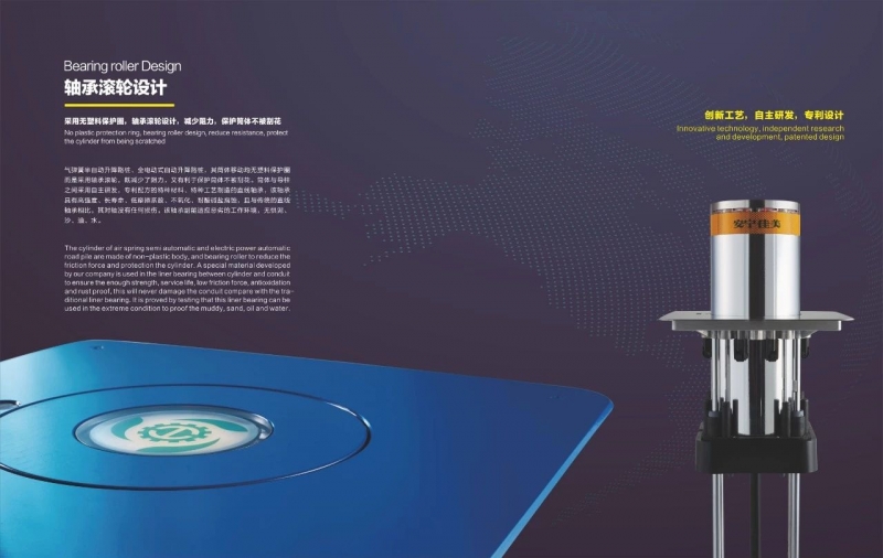 氣彈簧半自動升降路樁、全電動式自動升降路樁,其筒體移動均無塑料保護圈,而是采用軸承滾輪,既減少了阻力,又有利于保護筒體不被刮花。筒體與導柱之間采用自主研發,保密配方的特種材料、特種工藝制造的直線軸承,該軸承具有高強度、長壽命、低摩擦系數、不氧化、耐酸堿鹽腐蝕,且與傳統的直線軸承相比,其對軸沒有任何損傷。該軸承副能適應惡劣的工作環境,無懼泥、沙、油、水。
