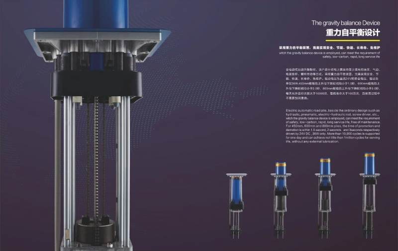 全電動式自動升降路樁,該產品在結構上摒棄市面上現有的液壓、氣動、電液推桿、螺桿傳動等方式,采用重力自平衡裝置,完美實現安全、節能、快速、長壽命、免維護。驅動電壓為直流24V的安全電壓,驅動功率僅36W,450mm規格的上升與下降時間均小于1.5秒,600mm規格的上升與下降時間均小于2.0秒,800mm規格的上升與下降時間均小于3.0秒,每天允許運行次數大于10000次,整機壽命大于100萬次,且使用過程中不需要加潤滑油。