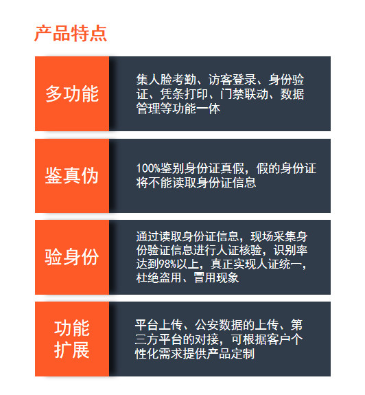 Face智能終端系統(tǒng)由身份證閱讀器、高清數(shù)字攝像機、指紋儀、IC卡模塊、打印機模塊及系統(tǒng)軟件構成。系統(tǒng)采用深度神經(jīng)網(wǎng)絡人臉識別算法,結合最新身份證閱讀器應用技術,通過現(xiàn)場采集的照片、指紋數(shù)據(jù)實現(xiàn)與身份證上的照片和指紋數(shù)據(jù)進行身份的比對核驗,人臉考勤登記、訪客登記及門禁系統(tǒng)聯(lián)動等功能。
