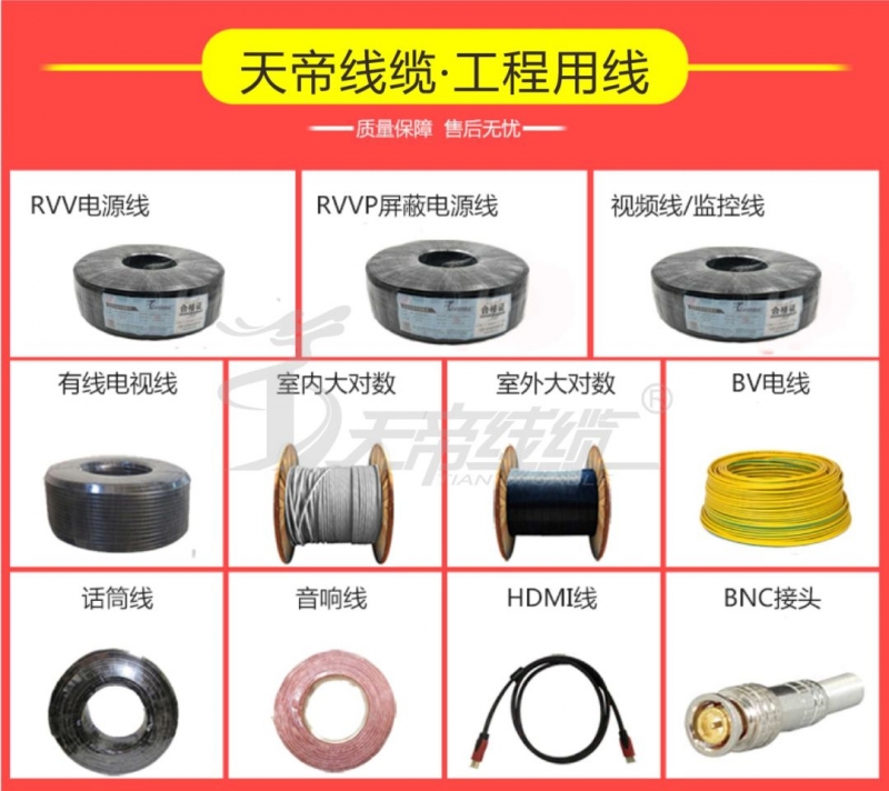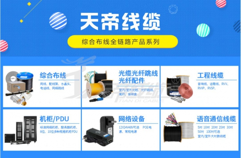 公司主要產(chǎn)品有安防類線纜,通訊傳輸類線纜,光纜,綜合布線產(chǎn)品及配件。綜合布線提供銅纜、光纜、及家居布線系統(tǒng)解決方案、信息化端到端的服務(wù)。產(chǎn)品廣泛用于網(wǎng)絡(luò)監(jiān)控、智能樓宇、網(wǎng)絡(luò)通訊、音響系統(tǒng)、計算機(jī)網(wǎng)絡(luò),有線電視及工礦企業(yè)配電控制系統(tǒng),綜合布線系統(tǒng)等領(lǐng)域。在國家機(jī)場、地鐵、智能大樓,學(xué)校,銀行等多個國家重點(diǎn)建設(shè)項(xiàng)目中發(fā)揮著重要作用,天帝品牌已成為用戶首選的民族自主線纜布線品牌之一。